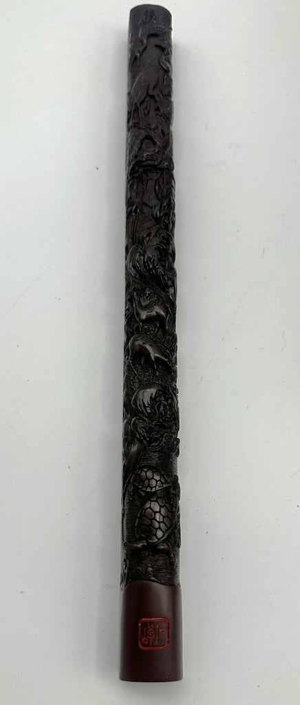 Large Chinese inkstone with turtle and foo dog motifs. Mid 19th century. Carved wood stand.