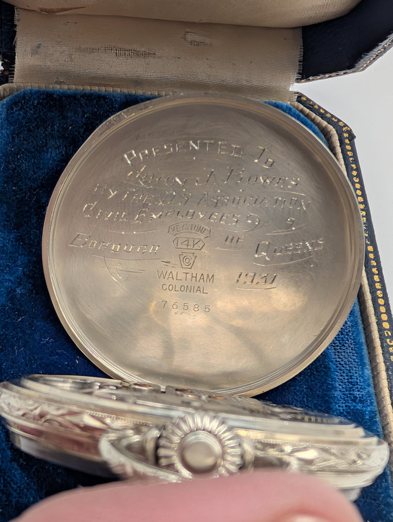 Back monogrammed JJB. Engraved inside, "Presented to John J. Bowes by the DS Association Civil Employees Borough of Queens 1931"