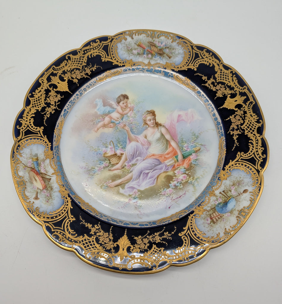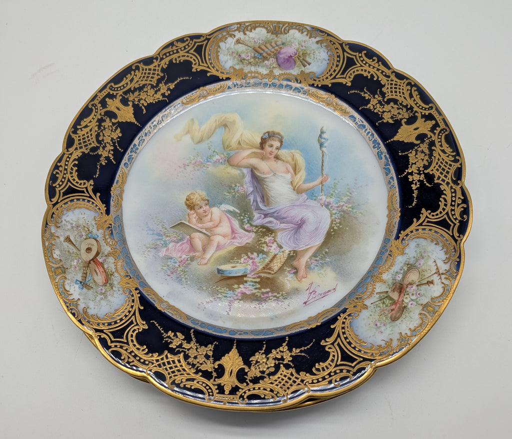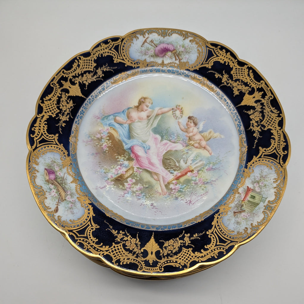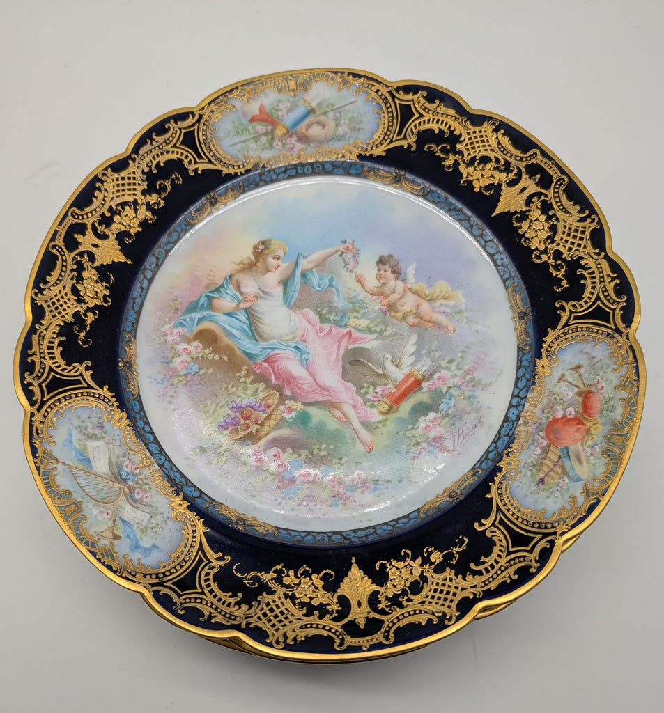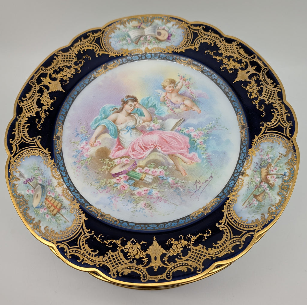 Set of twelve Sevres-style cabinet plates. Cobalt blue and gold border with medallions of instruments. Each with a different classical scene of woman with cherub. Each signed V. Bernard.