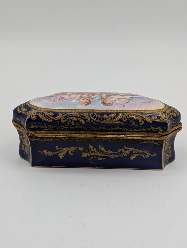 Small dressing table or jewelry box. French Sevres porcelain. Cherub scene on lid. Cobalt blue and gold.
