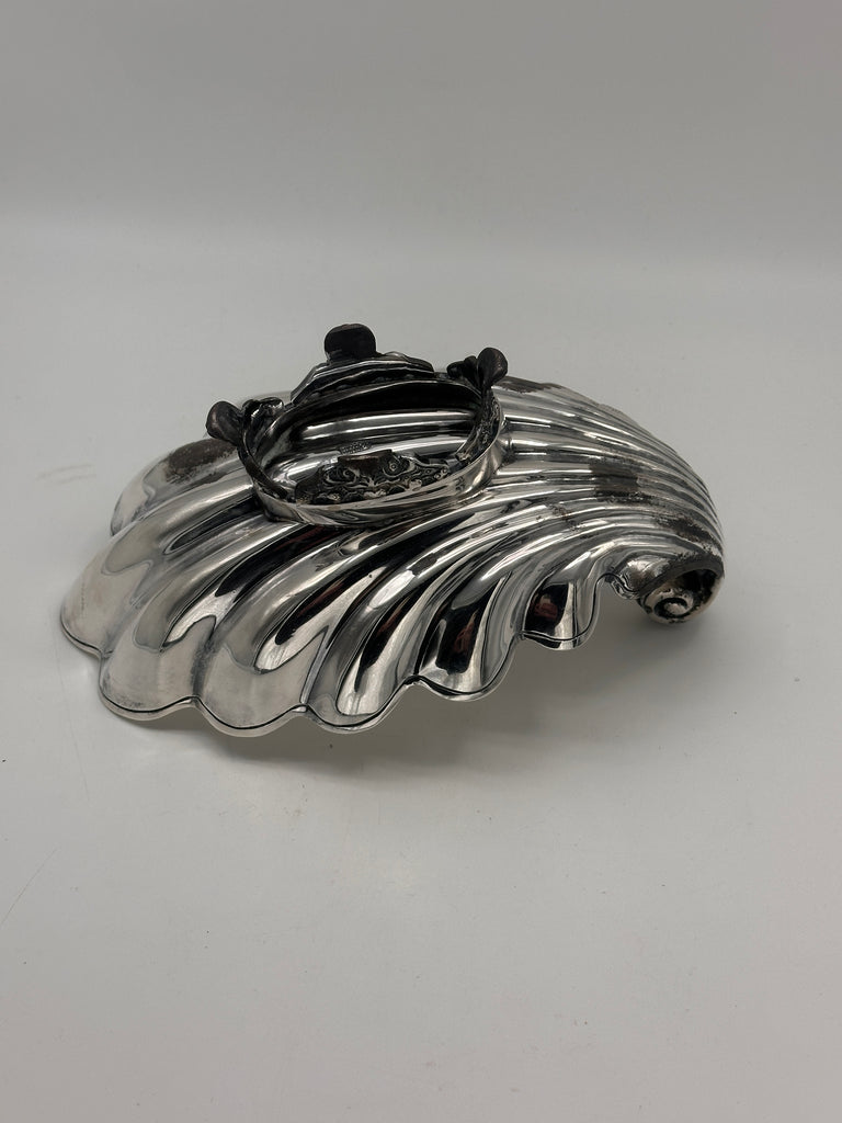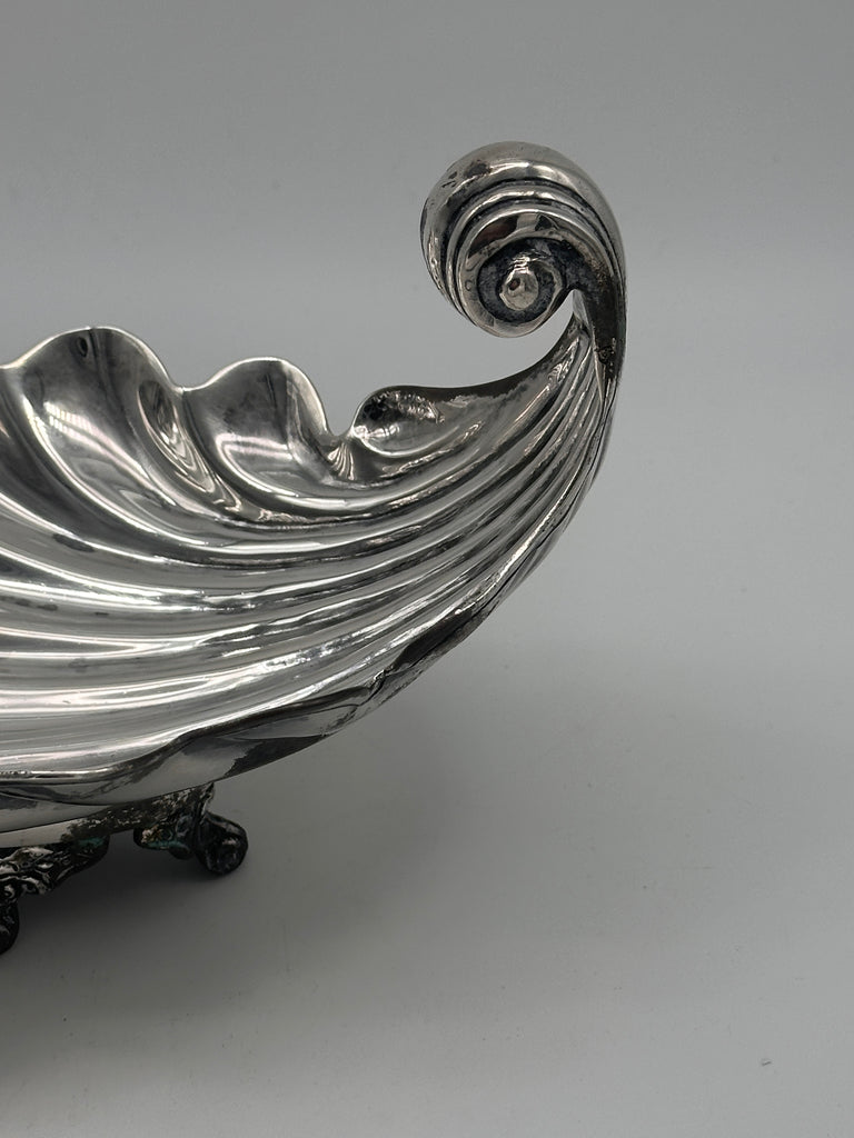Boat-shaped shell serving bowl on four scrolling feet. Mexican sterling silver. Sanborns.