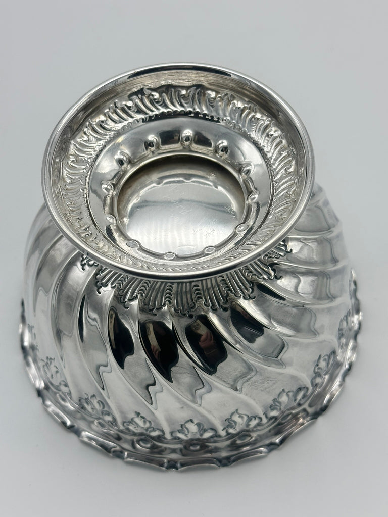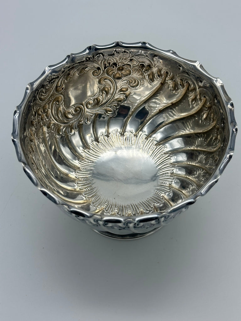 Footed bowl. English sterling silver repousse with flower and scrolling design. Unengraved central cartouche.