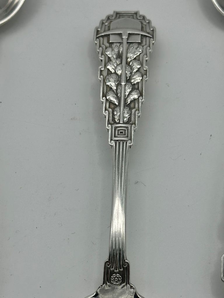 Pattern depicts a cactus with miner's pick and spade. Early Gorham mark and stamped Sta. Juliana.
