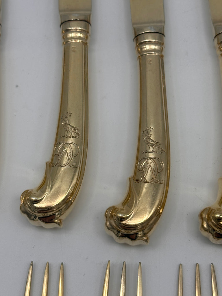 Exceptional fruit and cheese or dessert service for eight. English sterling silver with a gold wash allover.