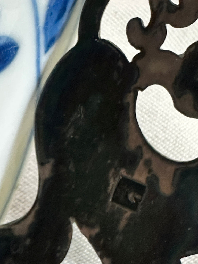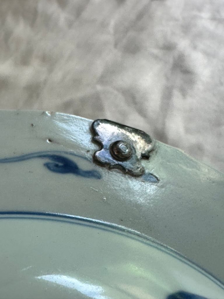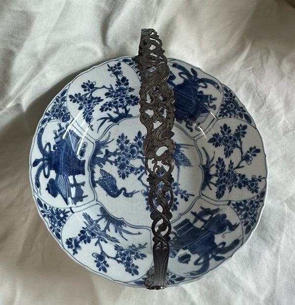 Chinese blue and white porcelain bowl. 18th century. Dutch pierced silver handle.