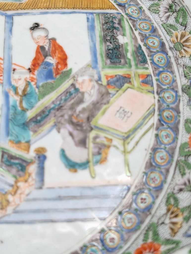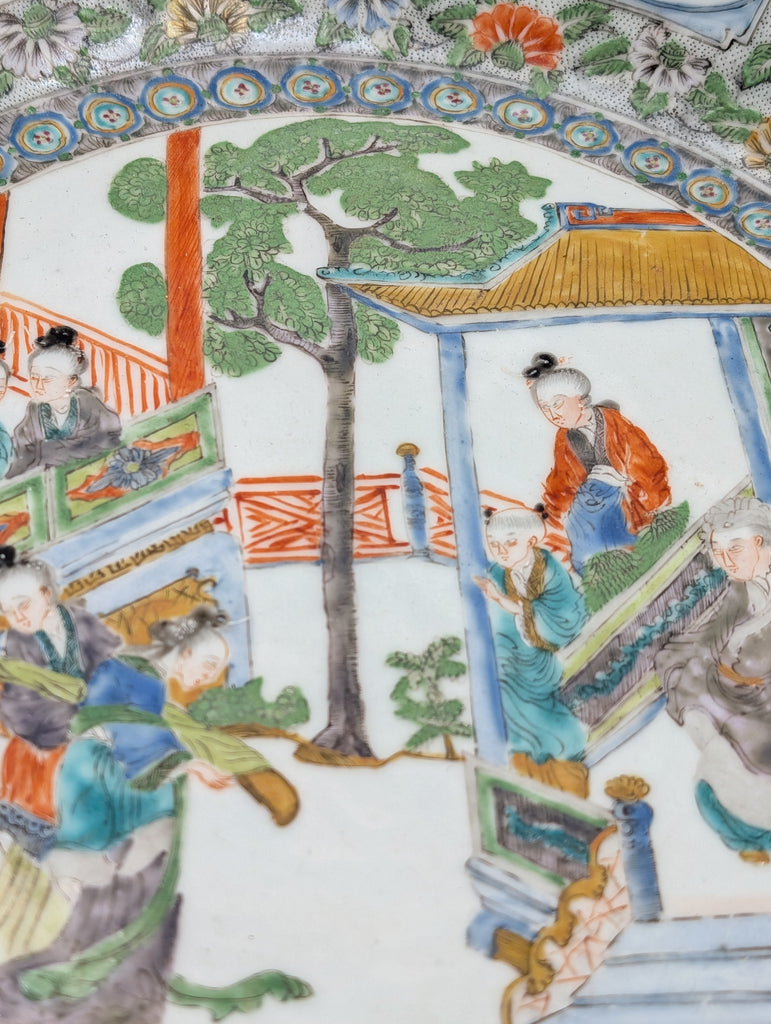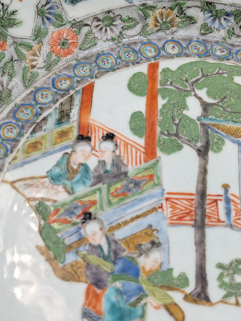 Famille verte with medallions of people in romantic gardens perusing art, games. Diaper pattern border with cartouches of birds and flowers.