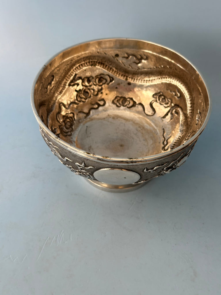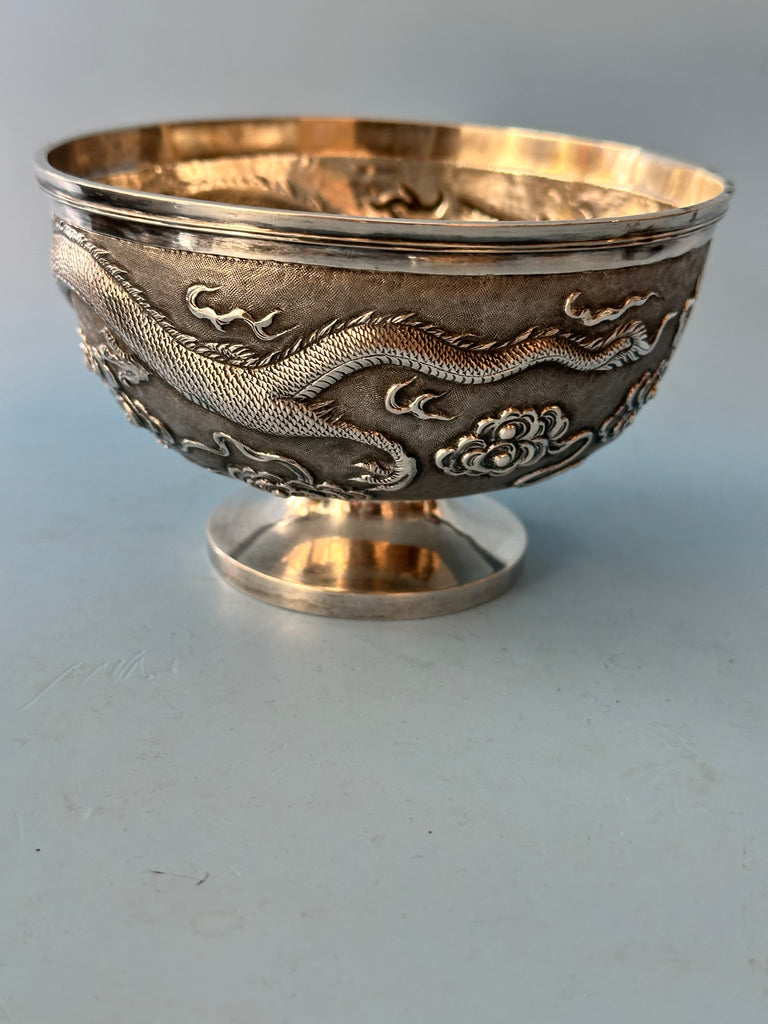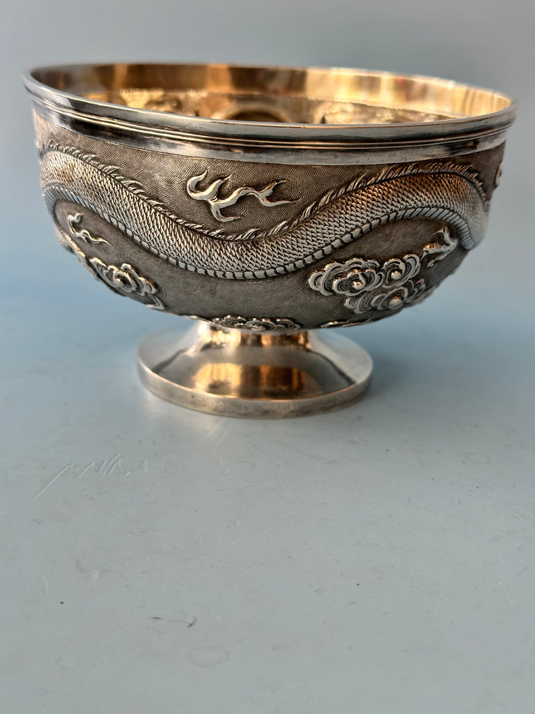 Chinese silver footed bowl. Dragon chasing flaming pearl.