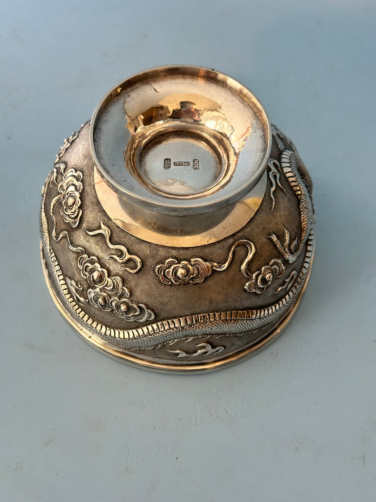 Chinese Silver Zeewo Footed Bowl. Dragon Chasing Flaming Pearl. 4 1/2" Diameter