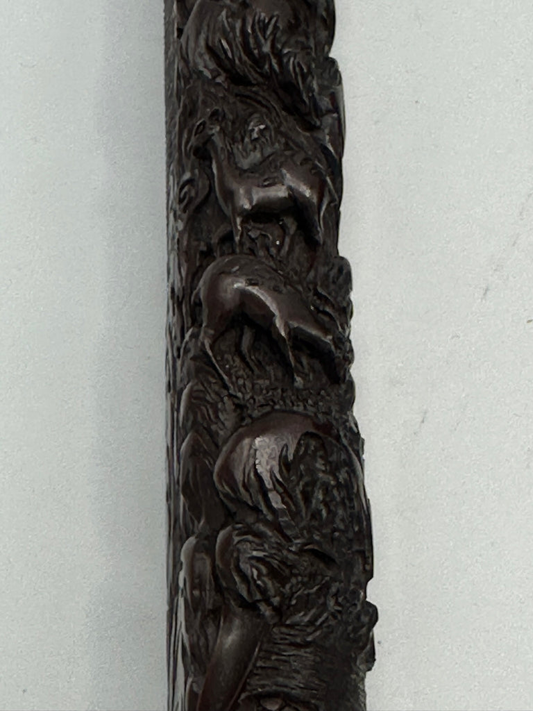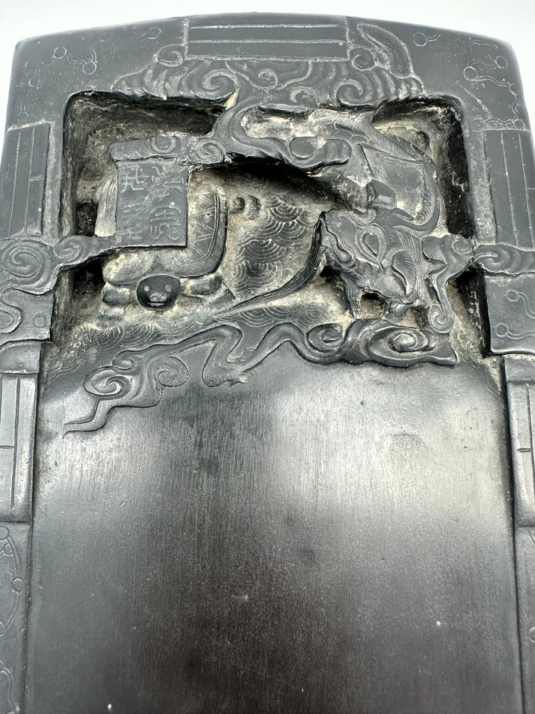 Large Chinese inkstone with turtle and foo dog motifs. Mid 19th century. Carved wood stand.