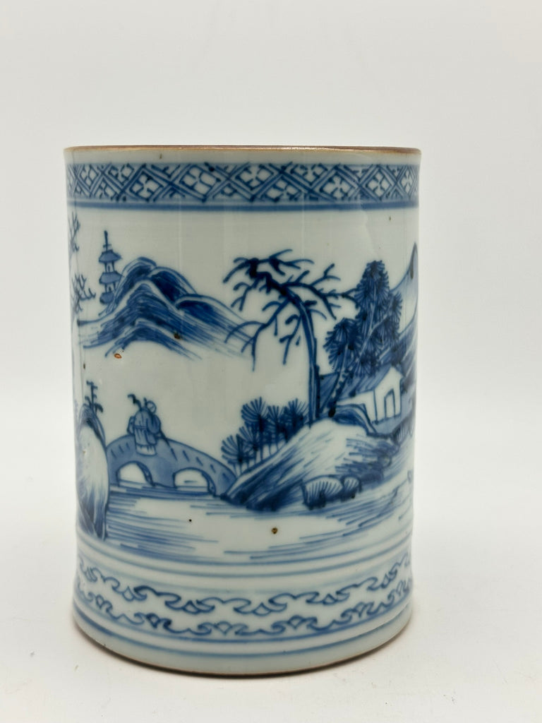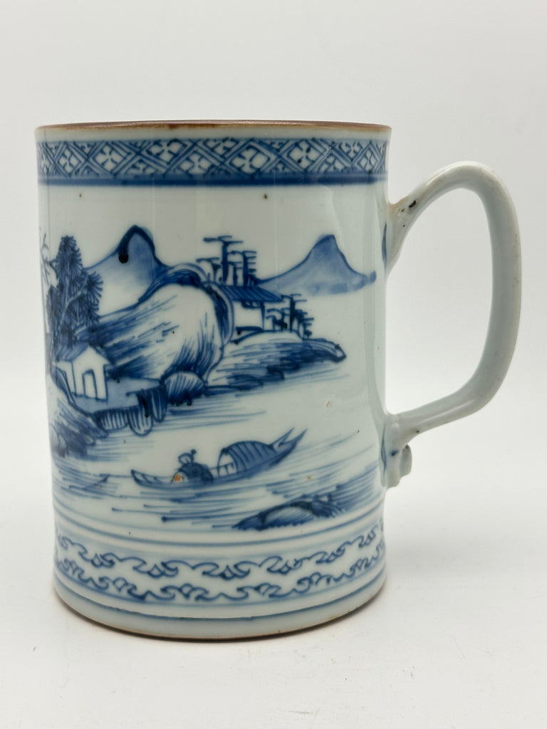 Large Chinese porcelain handled mug. Blue and white. Landscape scene with man on bridge over water, mountains, trees, buildings, boat. 18th century.
