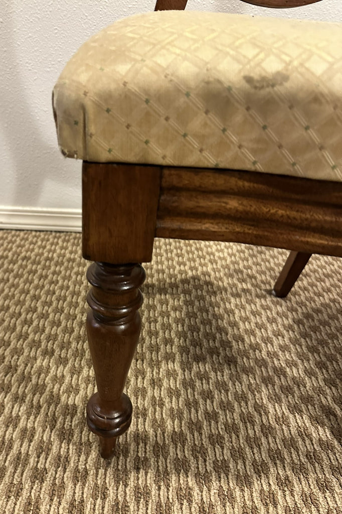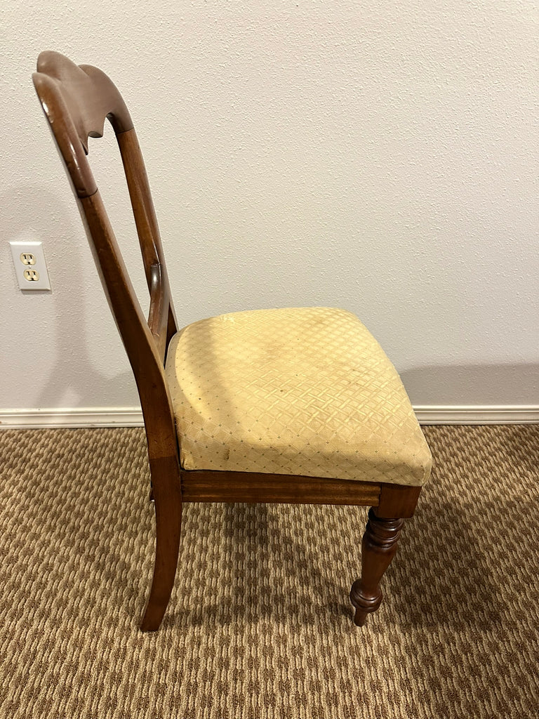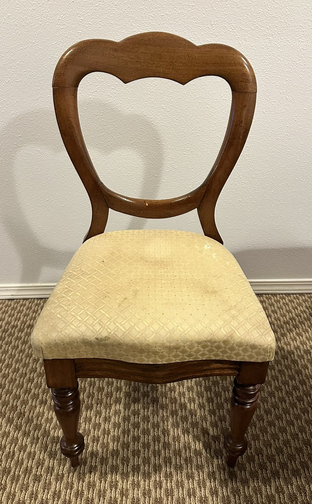 Eight balloon back side chairs. Upholstered seats need to be cleaned or reupholstered. Chairs are sturdy and usable.