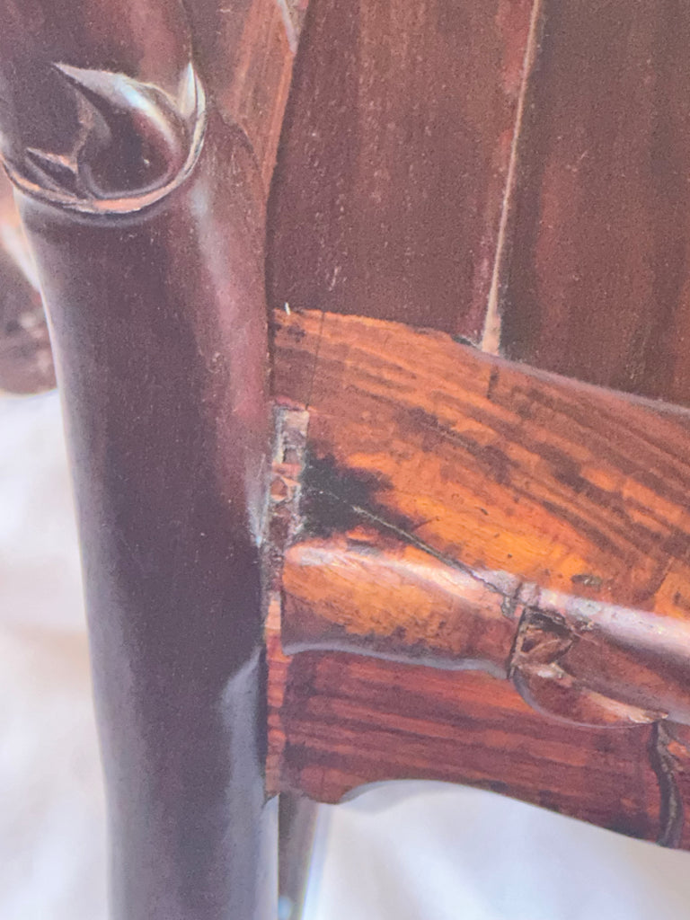 Normal shrinkage and minor cracks from age. Separation to a joint on back of one chair. One back leg with crack.