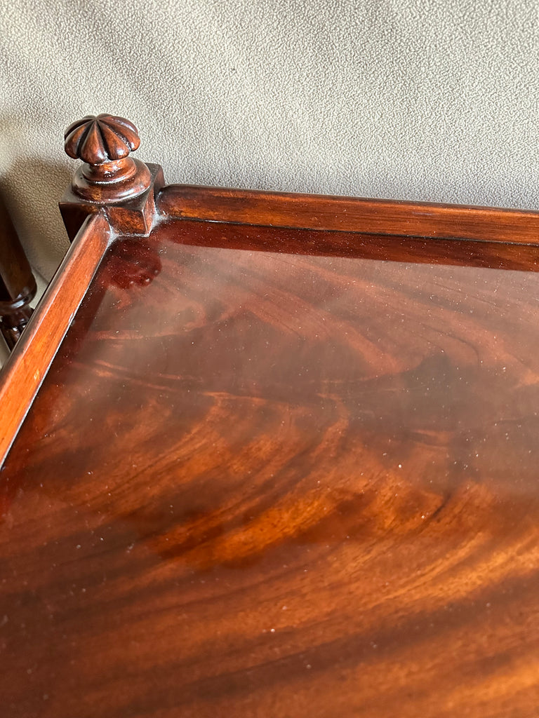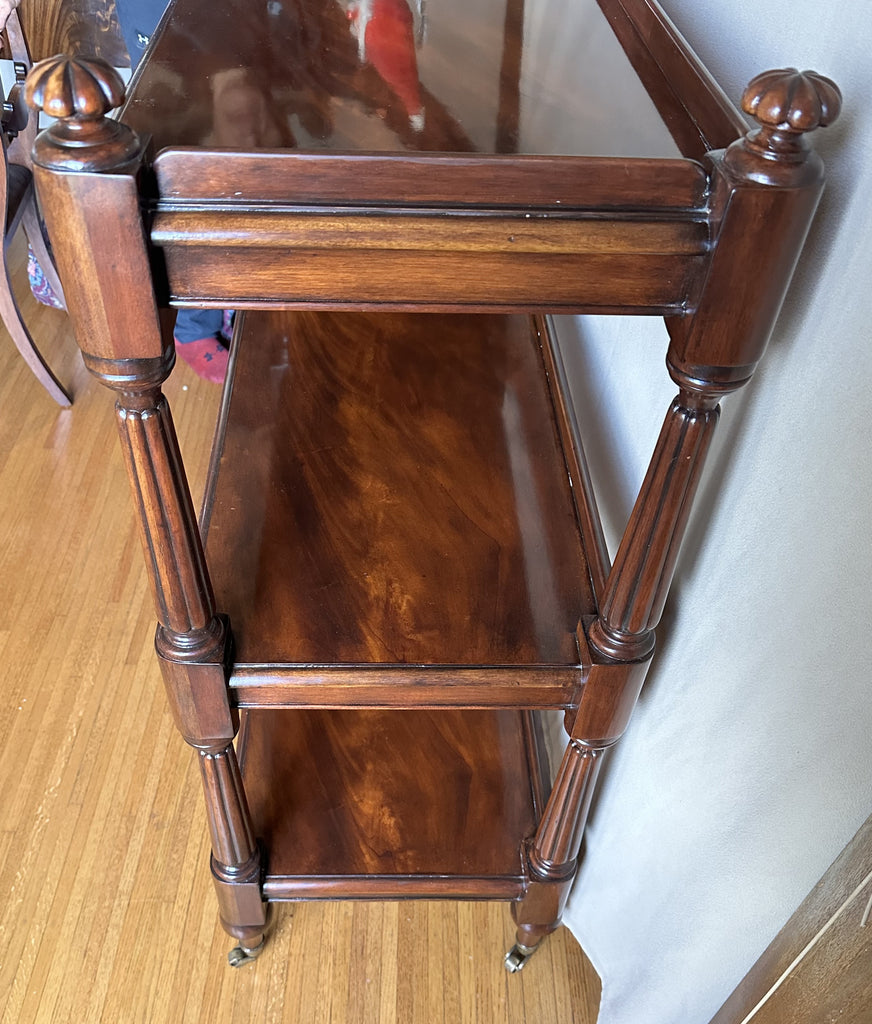Serving etagere table. Mahogany wood. Three shelves. Reeded columns. Brass caster wheels.William IV. Early 19th century.45 1/2" height to top of finial, 44" width, 18" depth