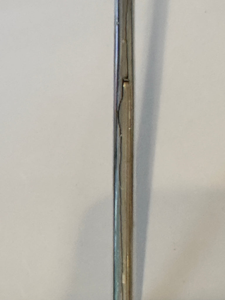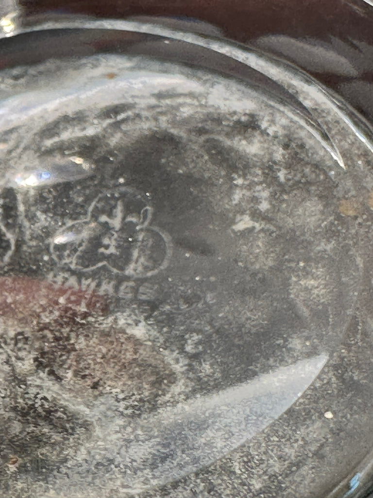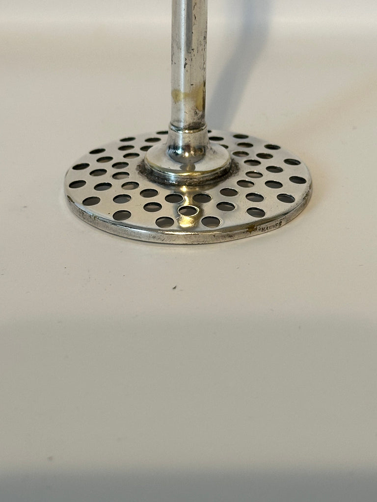 Glass is in excellent condition. Stirred appears to be silverplated with worn gilding on handle. Crack in the stem of stirrer, still useable. Some dings.