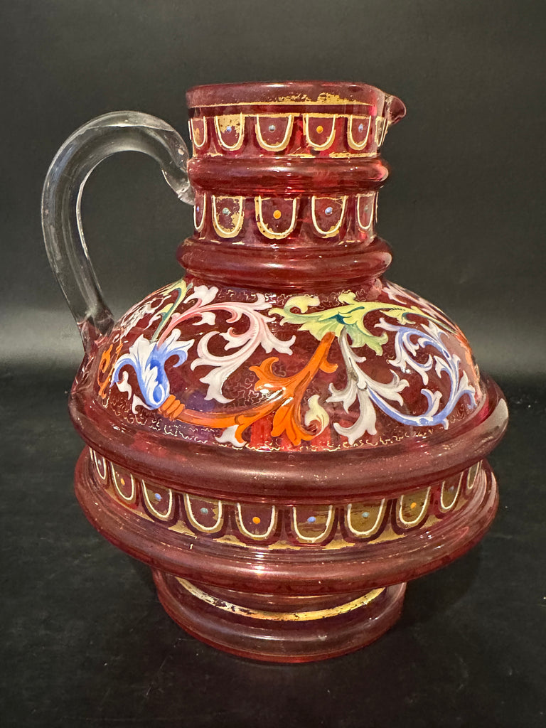 Moser Enameled Cranberry Glass Pitcher. Circa 1900. 6 1/4" H.