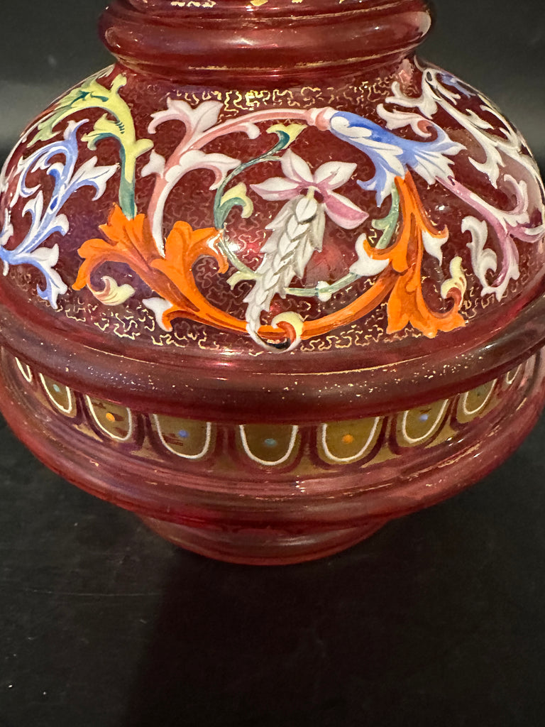 Moser cranberry glass pitcher enameled with scrolling colorful flower motif.