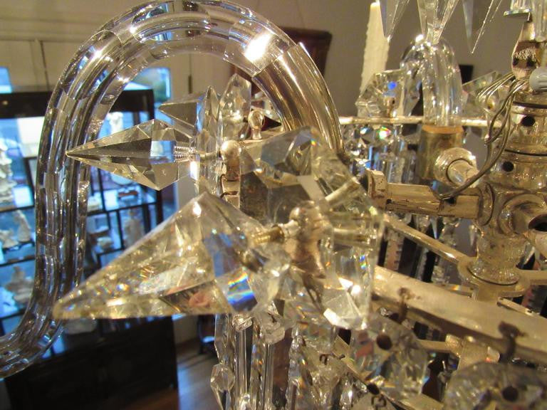 Gorgeous European crystal chandelier, early 20th century. Two sections of hanging prisms down to the center basket with three graduating rings of prisms with center ball top accented with crystal spears. Four cut-glass arms with hanging prisms. Measures: 38" total length by 33" diameter.