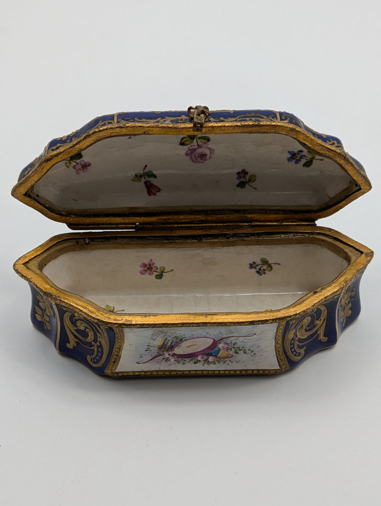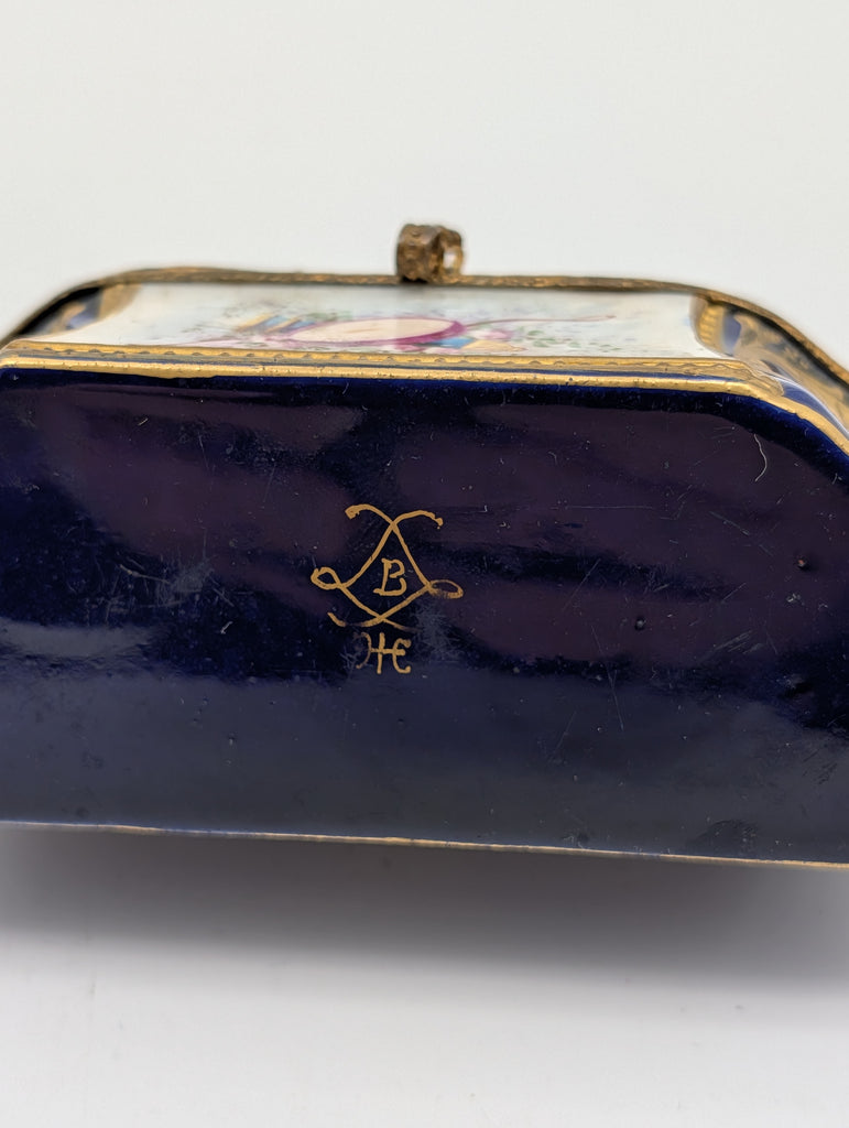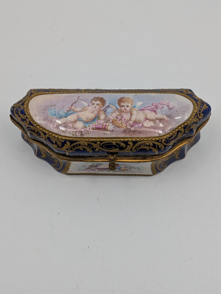 Small dressing table or jewelry box. French Sevres porcelain. Cherub scene on lid. Cobalt blue and gold.