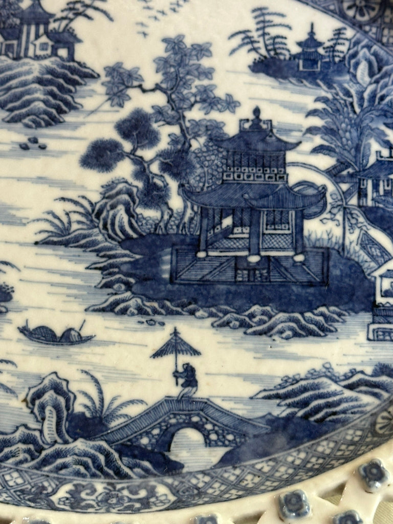 Reticulated Bowl and Underplate. English Blue and White Basket. 18th Century