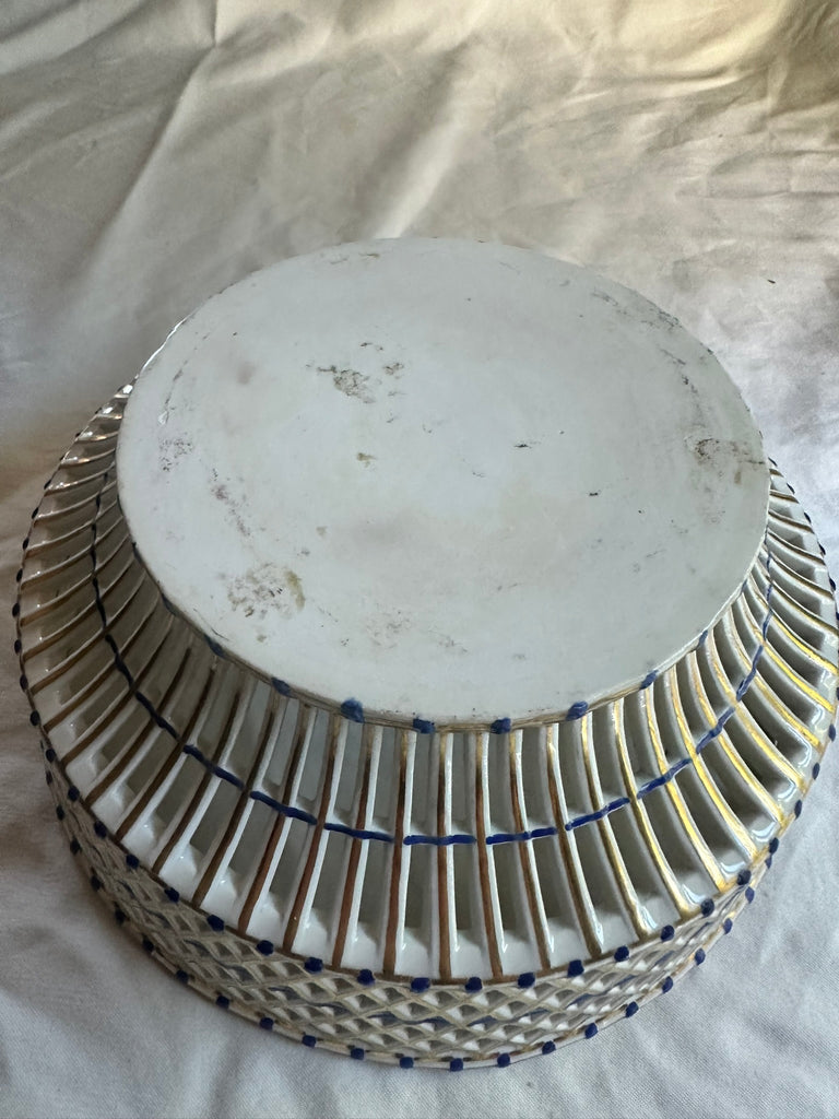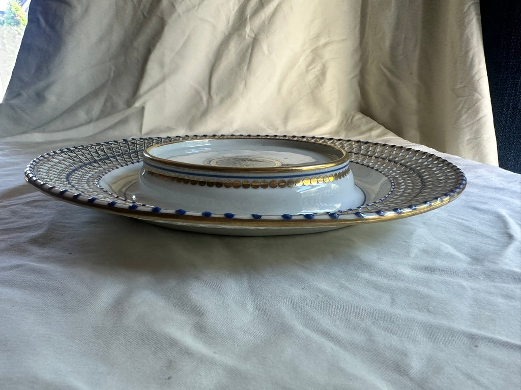 Austrian Vienna porcelain bowl on stand. Reticulated white porcelain with blue and gold. 18th century.