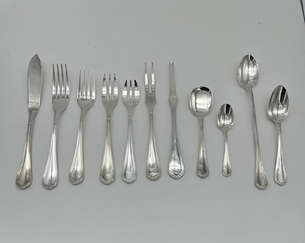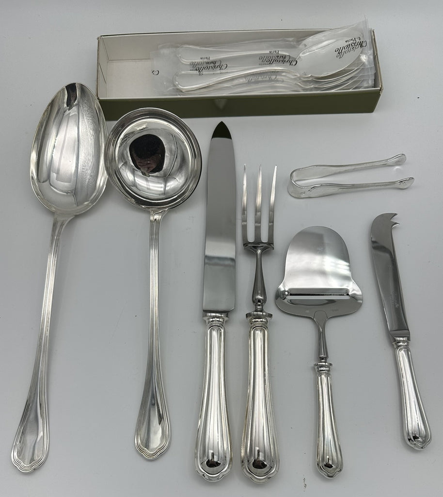 Large collection of 307 pieces Christofle French silverplate flatware in the Spatours pattern. Mark used 1935-1983. Overall excellent almost new condition.