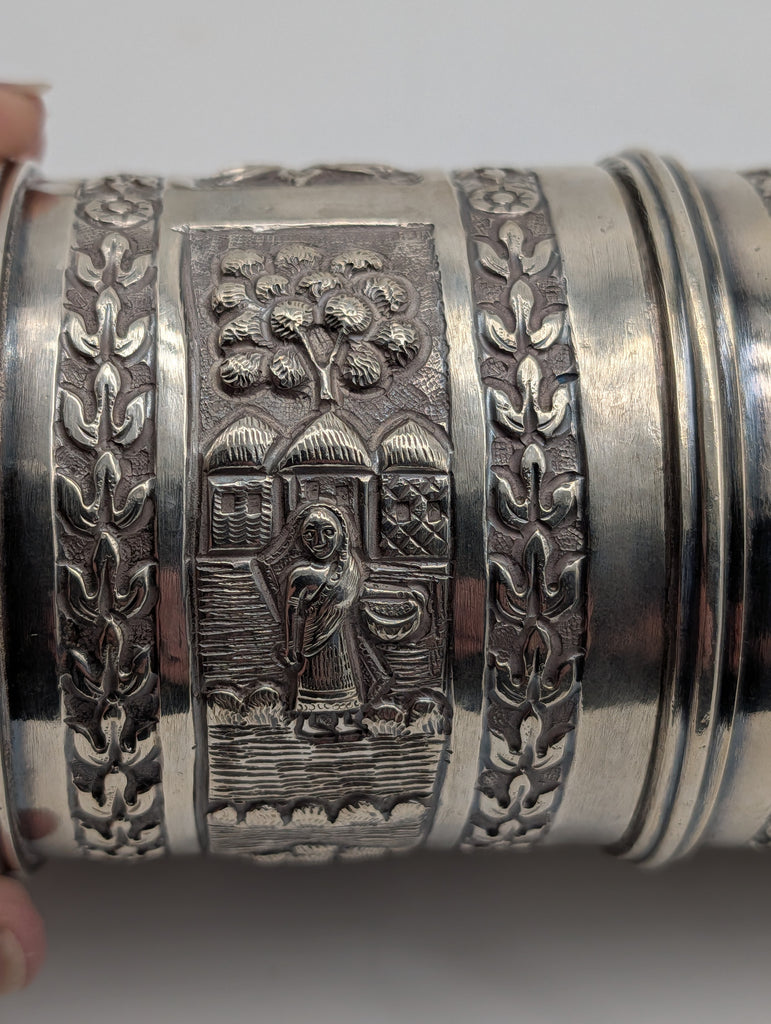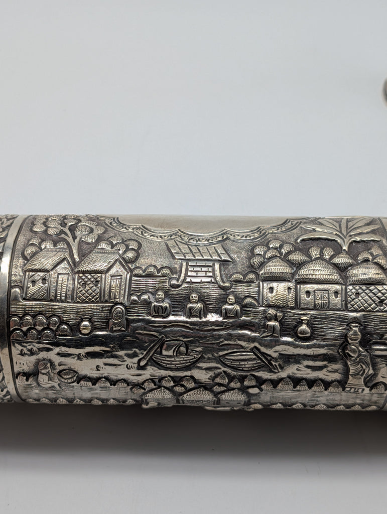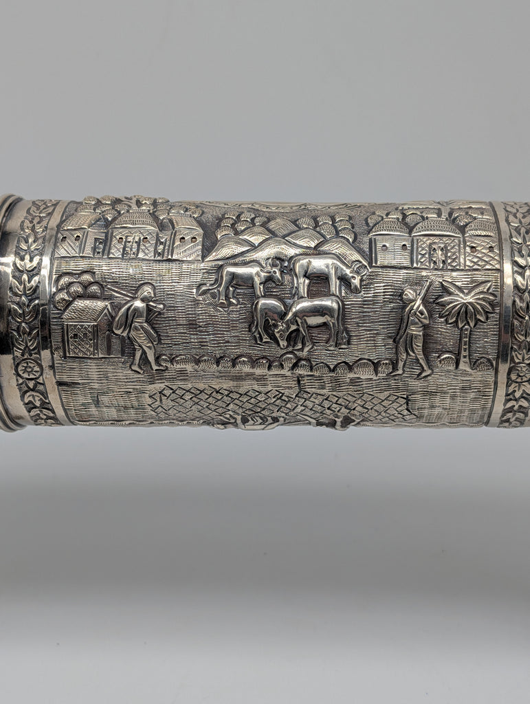 Indian 925 sterling silver document box or scroll holder on stands. Repousse scenes with farmers, huts, cows, etc.