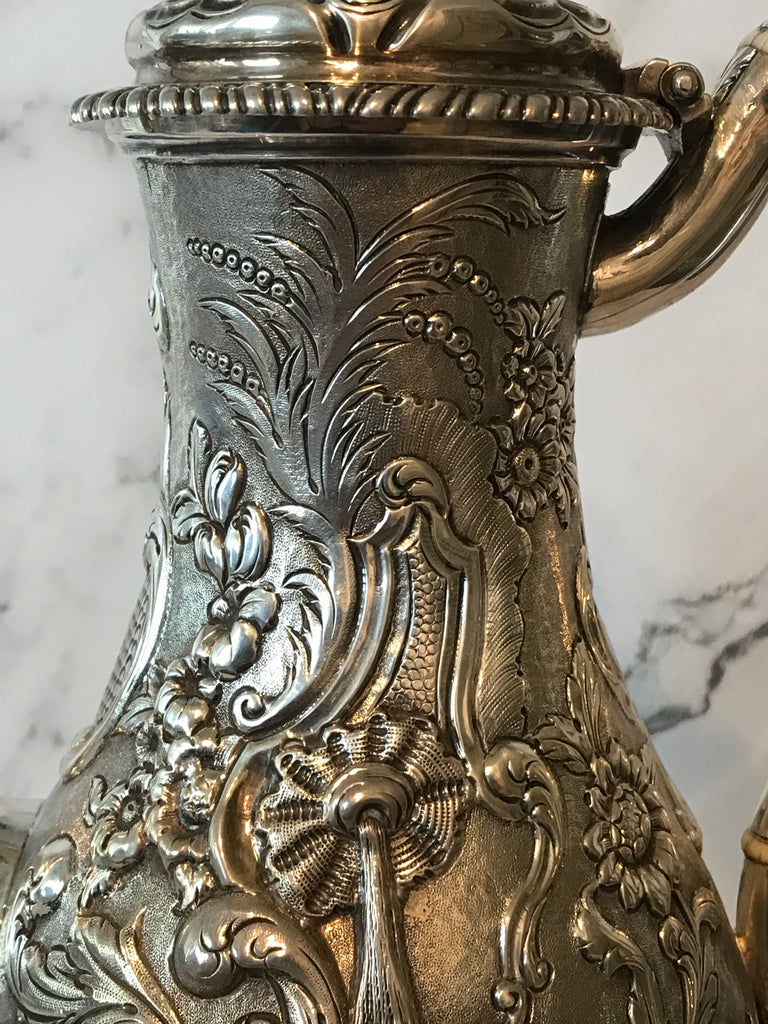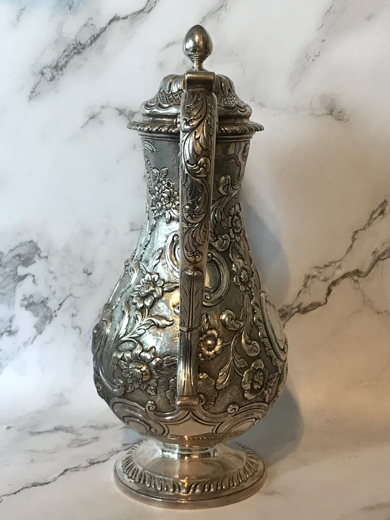 Scottish George III Sterling Silver Coffee Pot. Repousse. Late 18th Century. 12"