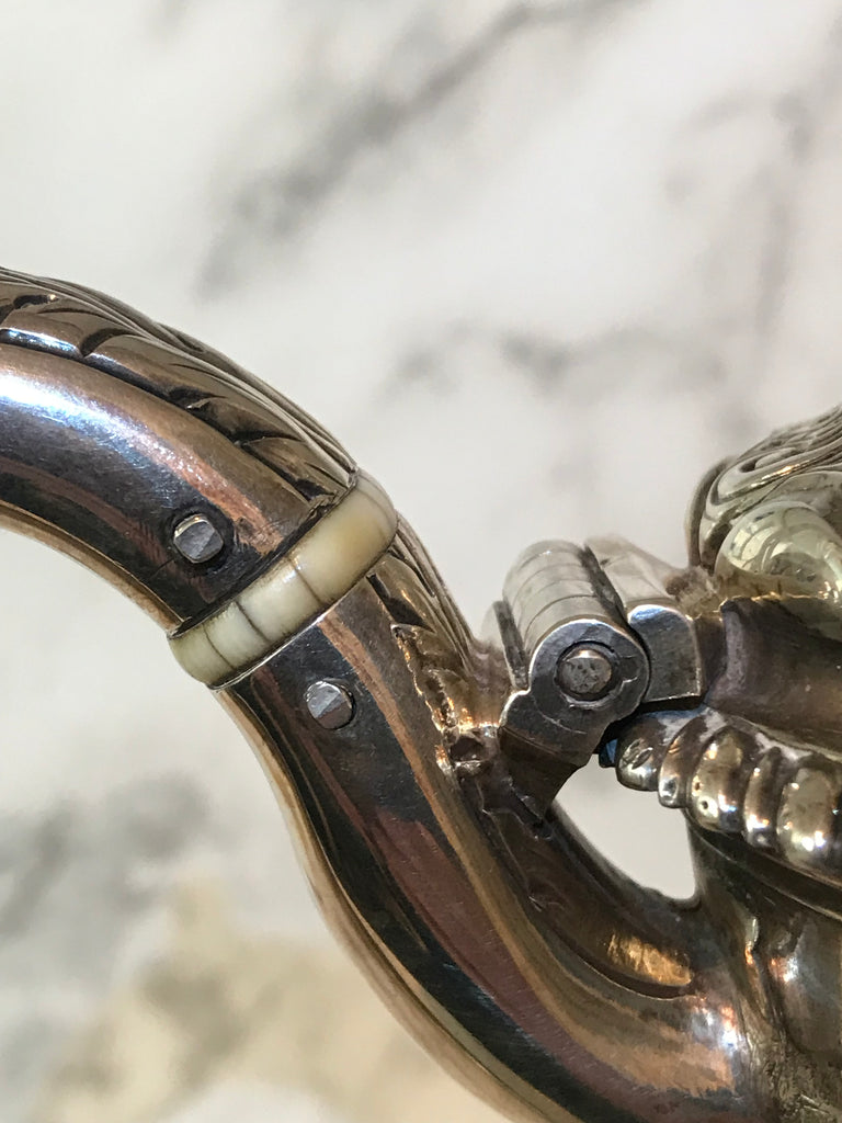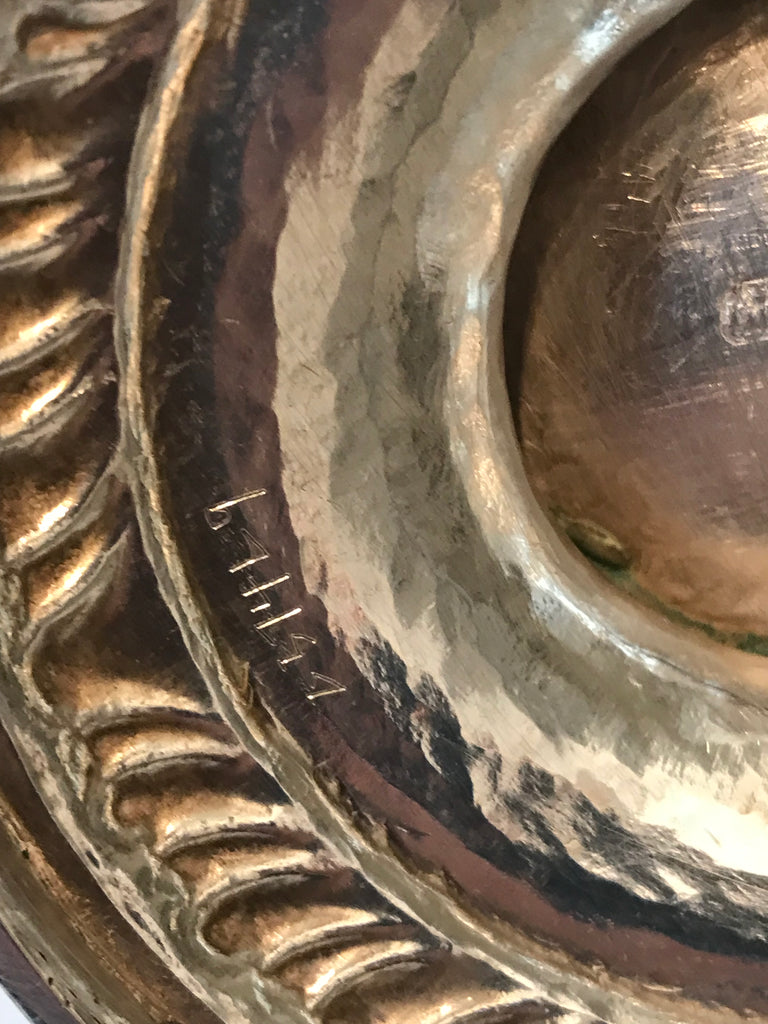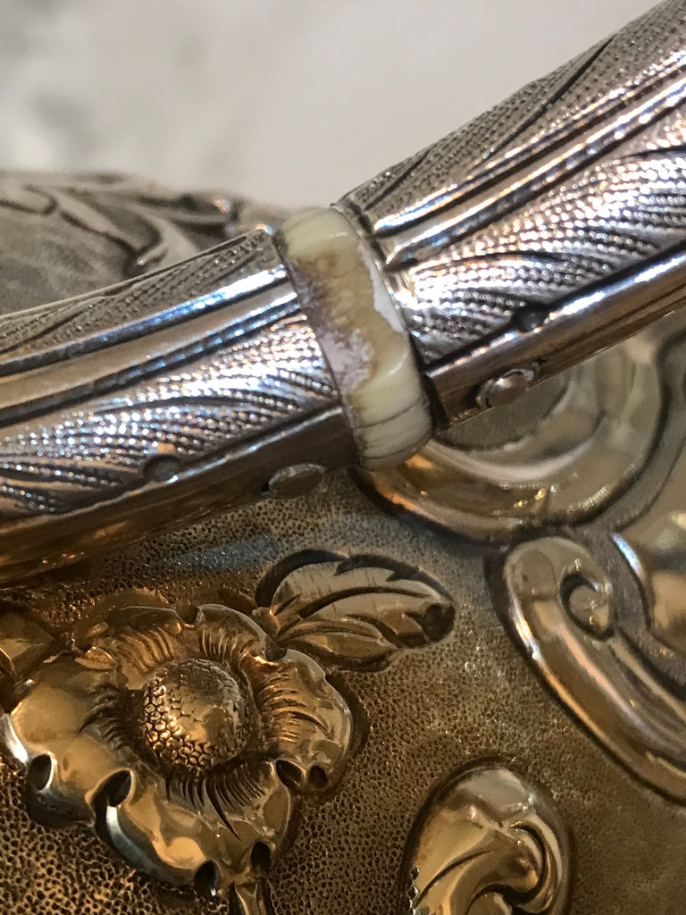 Beautifully repousséd with thistles, roses, leaves, and a garden fountain motif.