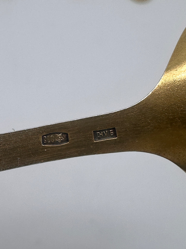 Set of Six Russian 875 Silver and Enamel Coffee Spoons Gold Wash. 5 3/4" 140 g