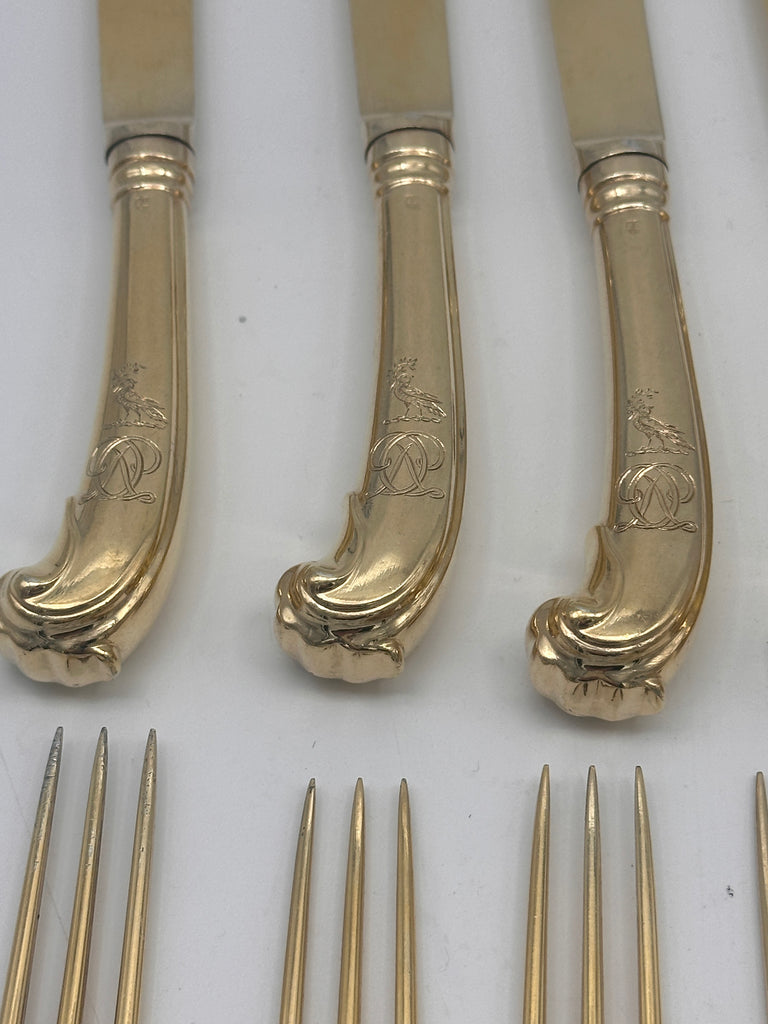 Exceptional fruit and cheese or dessert service for eight. English sterling silver with a gold wash allover.